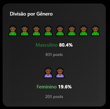 O relatório mostra que na opinião pública e política, há um ponto em comum: em ambos, o público masculino é maioria nas postagens das redes sociais. 69,1% dos posts dos cidadãos são realizados por homens, enquanto na política, esse número sobe para 80,4%.