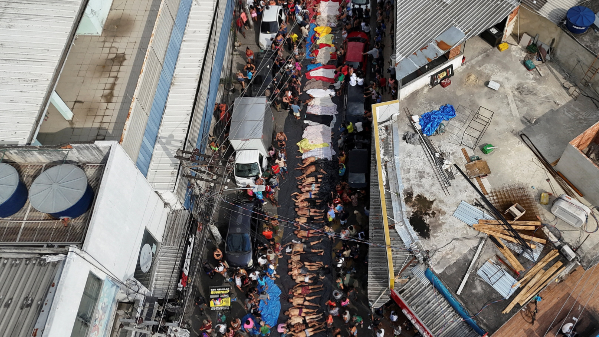 Uma rua do Rio de Janeiro próxima ao Complexo do Alemão amanheceu com mais de 40 corpos, e mais cadáveres estavam sendo transportados para o local na manhã desta quarta-feira (29/10), após a operação policial mais letal da história da cidade na véspera, disse uma testemunha da Reuters no local.