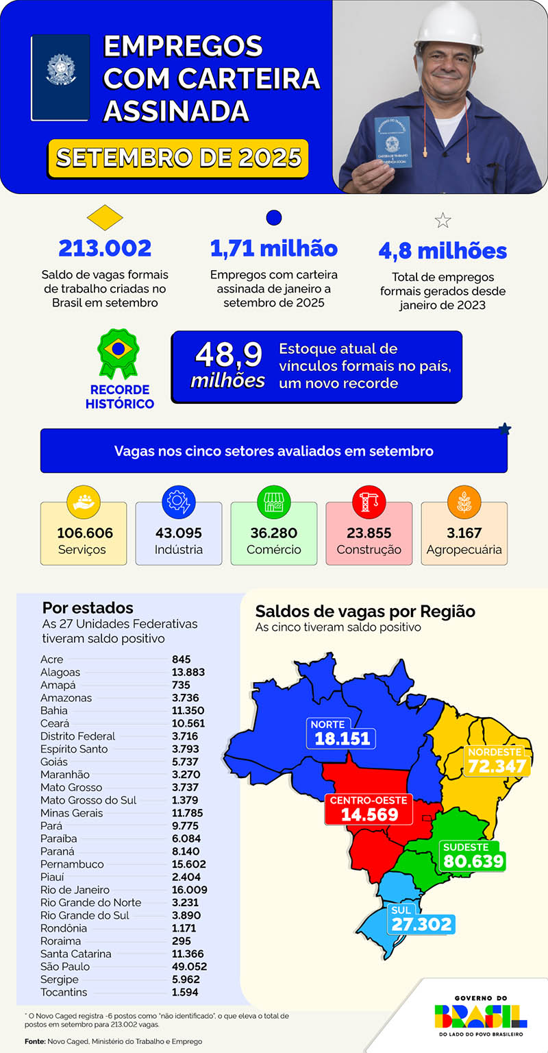 Somente em setembro, o saldo foi positivo em 213.002 novos postos de trabalho — bem acima das projeções de mercado, que esperavam no máximo 175 mil. Foram 2,29 milhões de admissões e 2,07 milhões de desligamentos no mês.